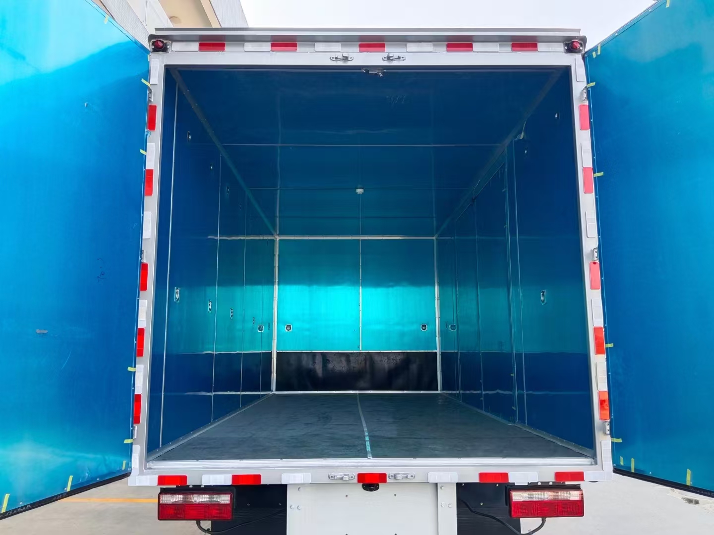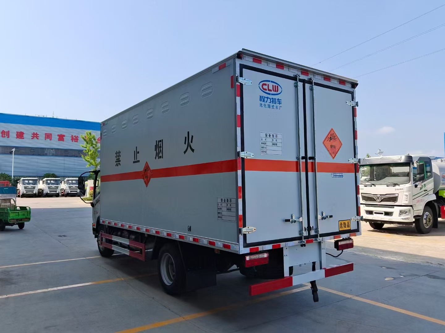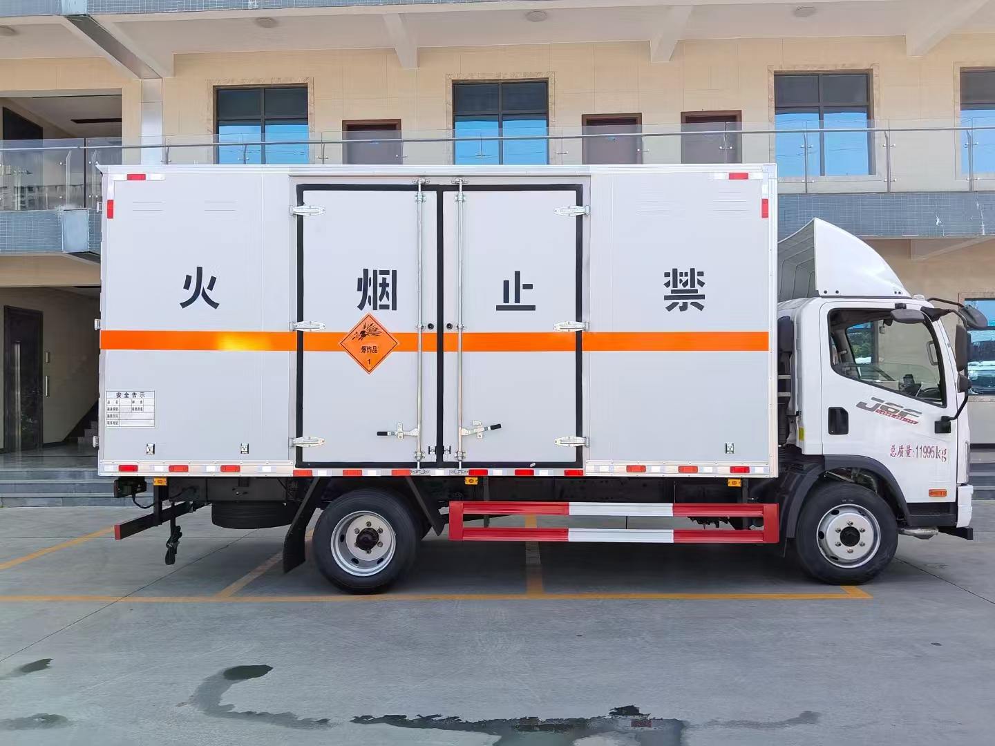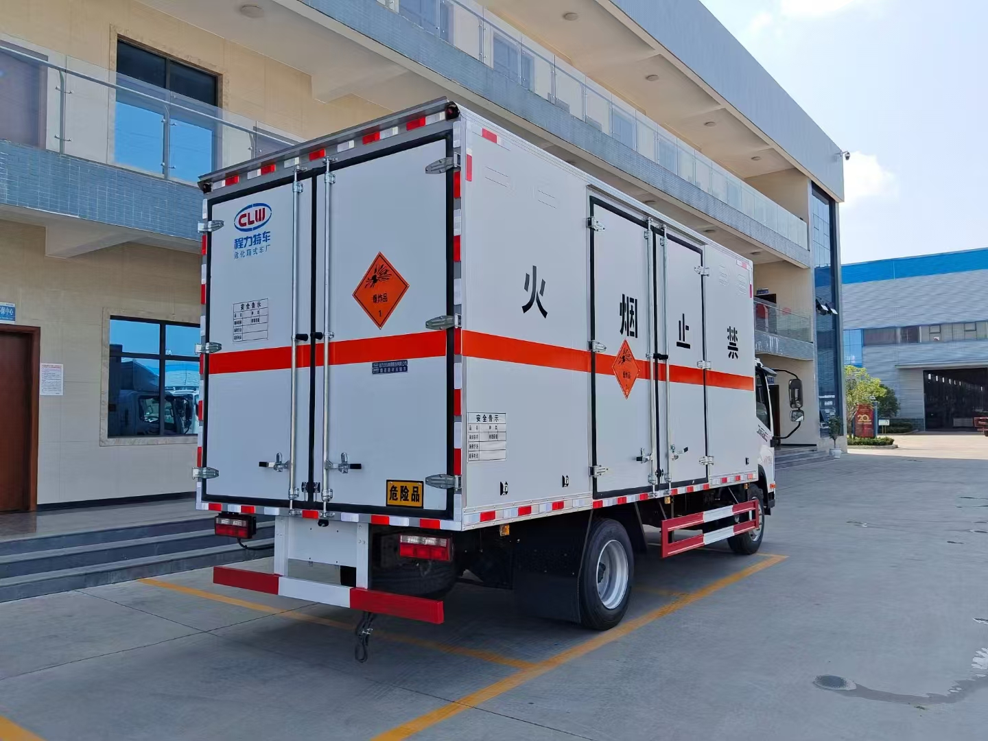 貨箱配置 廂體為雙層金屬骨架結構,外板采用冷軋鋼板,中間填充阻燃泡沫,內飾為鋁板。底板為平板上鋪防靜電膠皮。廂內兩側加裝固定貨物臥環,門框帶防盜報警器,頂部帶煙霧報警器,廂體右側選裝側門,隨車配2個滅火器,危險標志牌,防火帽,危險品三角頂燈。 (尾部可選裝液壓升降尾板)