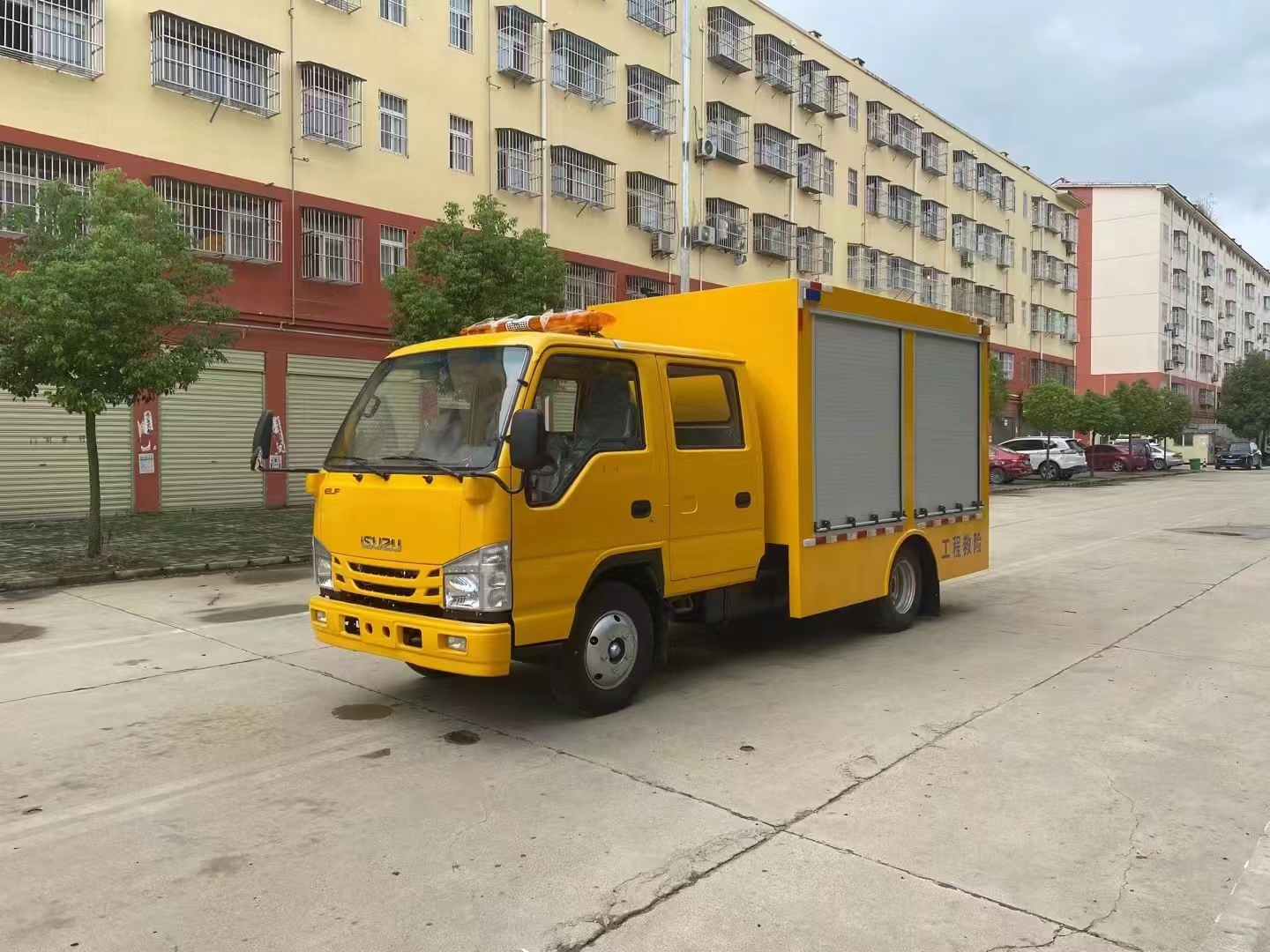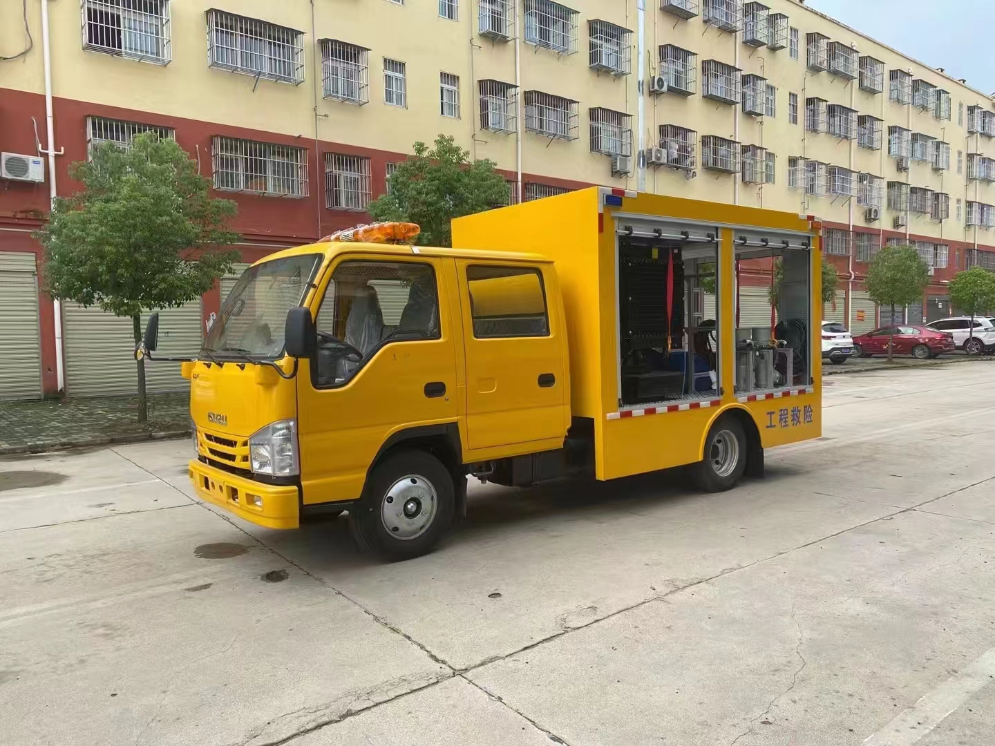 | 上裝配置 | 車箱一體式全封閉車箱車箱有隔音功能,廂體防火,阻燃,防雨,防塵,防銹,降噪,隔震,長期抗震結構,廂體外觀按照公告外觀制作,左右卷簾門,尾部是卷簾門,廂內安裝LED作業燈,作業燈帶獨立開關,底板采用花紋板。配備康明斯50KW發電機組,2臺功率22KW便攜式超輕型高速潛水泵,單臺水泵流量可達500m³/h,單泵配40米排水管(20米/根),水管直徑 DN200mm,水管材質為滌綸長絲編織。配有升降照明燈,升降燈可通過無線和有線遙控兩種方式控制,升降燈升降高度為1.2米,可水平旋轉。帶接地樁和接地電纜線,便攜泵控制柜,潛水泵浮圈,長排警燈,倒車影像,配兩只手提式干粉滅火器2只。其余為標配… | ||