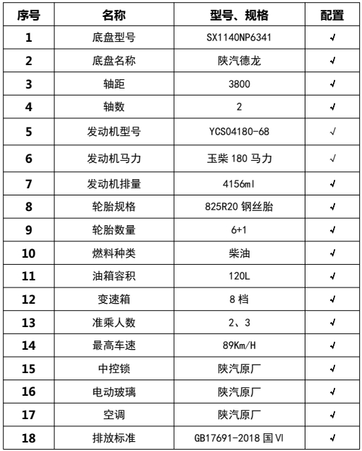 1,僅采用軸距3800mm;2、該車廣泛應用于修筑高等級公路瀝青路面灑布作業,主要專用裝置瀝青罐體,瀝青噴灑系統,罐體總容量:7.52立方米,有效容積:7.17立方米,罐體外形尺寸(長×寬×高)(mm):3600×2100×1550,介質:液態瀝青,密度:900千克/立方米;罐體保溫層厚度為50mm;3、側防護材料采用鋁合金,螺栓連接;后防護由專用裝置代替,下邊緣離地高400mm;4、ABS系統生產廠家:西安正昌電子股份有限公司,型號:ZQFB-V;后部安裝工作燈,僅在夜間駐車狀態下起照明作用,行駛過程中不可點亮。隨底盤選裝駕駛室;選裝駕駛室前擋風玻璃處增加攝像頭布置外觀。
